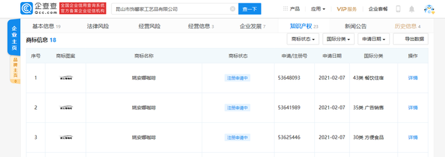 近日,昆山市飾馨家工藝品有限公司申請注冊多個“姚安娜咖啡”商標,國際分類涉廣告銷售、餐飲住宿、方便食品等,商標狀態(tài)為“注冊申請中”。企查查顯示,該公司成立于2013年6月,法定代表人為陳莉,注冊資本50萬元人民幣,與華為無商業(yè)關聯(lián)。