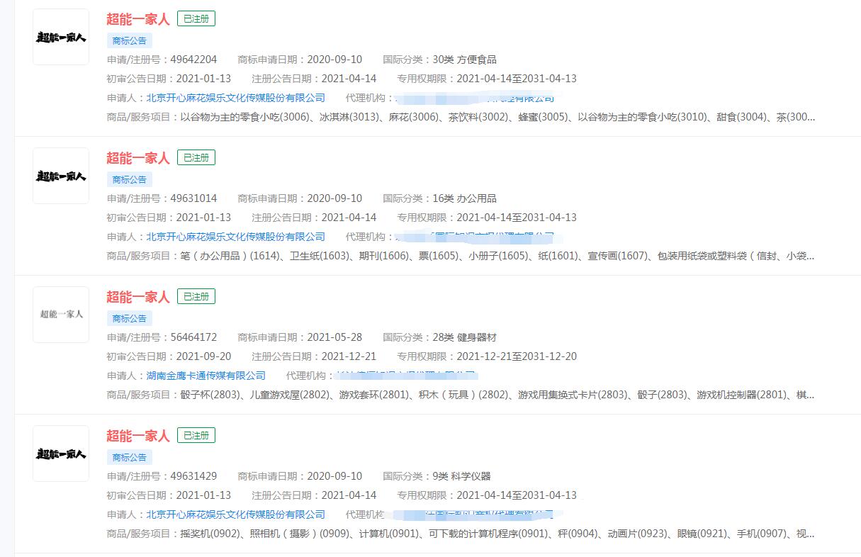 目前注冊成功的“超能一家人”商標已經有11個,范圍涉及方便食品,酒飲料,珠寶鐘表等多個種類。