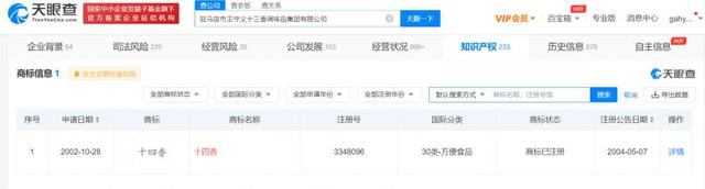 天眼查App顯示,“十四香”商標已被駐馬店市王守義十三香調味品集團有限公司成功注冊,其申請時間為2002年,國際分類為方便食品。截至目前,王守義公司已成功注冊“十二香”至“十八香”商標,以及“二十三香”“二十六香”“三十六香”“三十九香”商標,國際分類多為方便食品、食品。